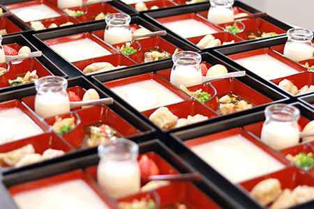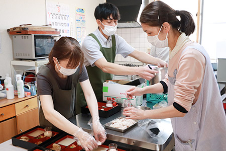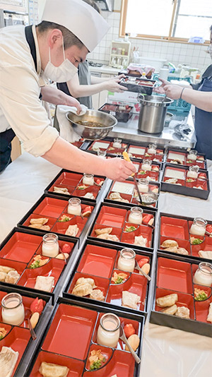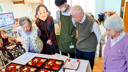 朱色の重箱は、一品一品丁寧に盛り付けられていき、見ているだけでも食欲がそそります。美味しそうな香りがただよいはじめ、自然と調理台に集まる入居者様。次々とできあがっていく料理を興味深く眺めていました。