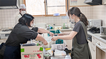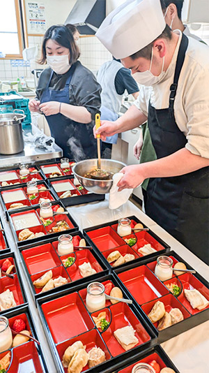 施設スタッフはシェフとシェフの奥様に盛り付け方法を指導いただき、一緒に盛り付けをお手伝いさせてもらいました。