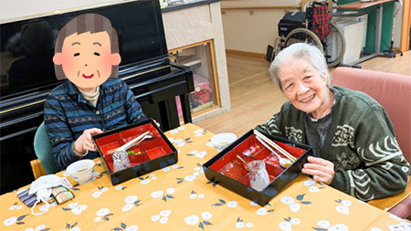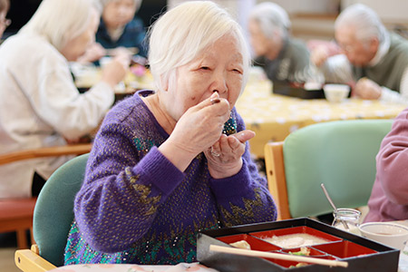 いざ食事が始まると、ほとんどの入居者様が完食。「おいしい。」「こんなに凄いの食べたことない。」「とろける~」などと、頬をゆるませながら和やかなランチタイムを堪能。