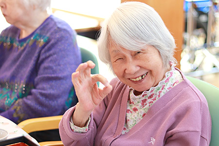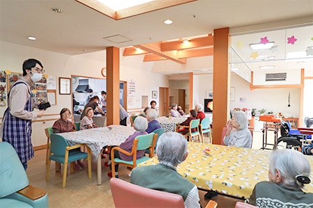 この日、館内はテーブルクロスと生花でドレスアップ。いつもとは違う雰囲気に、入居者の皆さんはきょろきょろと辺りを見渡しながら、何が始まるのだろうとわくわくした様子でした。