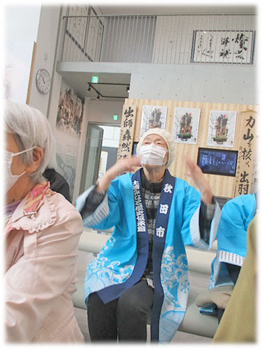 壁面にある大きなスクリーンでは、迫力ある曳山行事の本番映像が放映されており、お囃子に合わせて、自然に手が動きます。