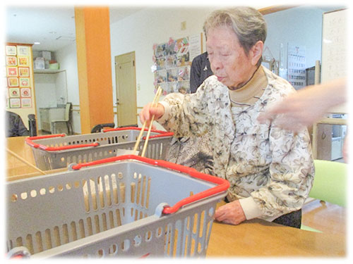 細長く切った新聞紙を菜箸で摘み取り、かごへ入れるゲームを行いました♪