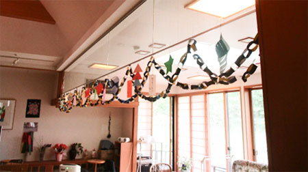 サラでは記入した短冊を、手作りの笹の葉飾りに飾りつけしました。