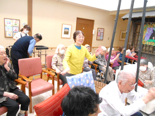 心地よいお囃子に合わせ、自ら踊りだしてしまう入居者も(笑顔)
