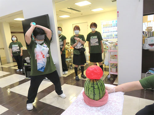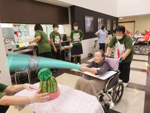 皆さま見事にスイカに見立てた紙風船を割ってくれました。