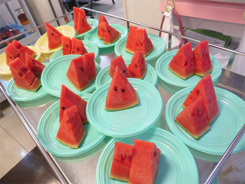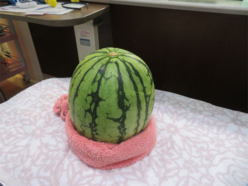横手市大雄産の小玉スイカ「チッチェ」をご準備しました。こちらなんと、職員のご実家で育てられた物なんです。