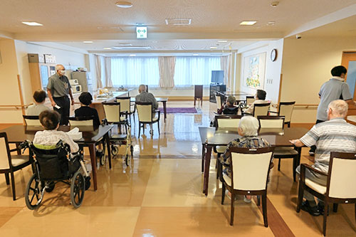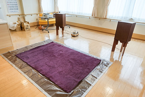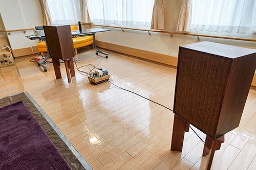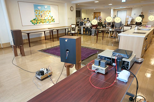 ボランティアの方が、ご自分で改良なさったスピーカーやアンプを持参し、高音質で音楽を聞かさせて頂きました。音の反射、反響等にも配慮頂き床にもシートを敷いて頂いたことにより、プレイヤーのみで聞くのとはかなり違い臨場感もありとても迫力のある音響でした。参加された入居者様からも、「コンサートホールにいるようだ」との感想を頂き、またこのような良い音楽を聴く機会を希望したいとのことでした。