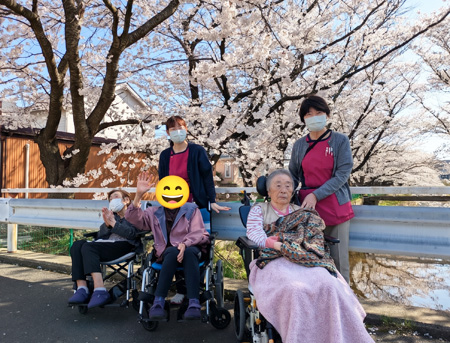 新年度を迎え日ごとに温かさが増し、様々な草花が咲き乱れる季節になりました。ソフィーの皆様がお元気に穏やかにお過ごしいただけますよう、職員一同お手伝いして参ります。新年度一回目の行事は、春のドライブツアーとお花見散歩です。ソフィーからほど近い草津川沿いの桜並木が満開の日にお散歩に行くことができました。「とっても綺麗な桜だね」「今年も立派に咲いたね」と喜びの声がたくさん聴かれました。